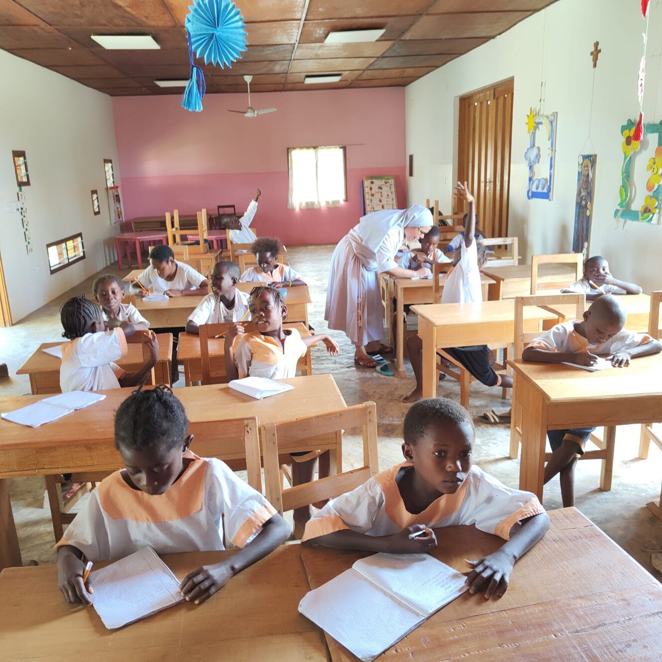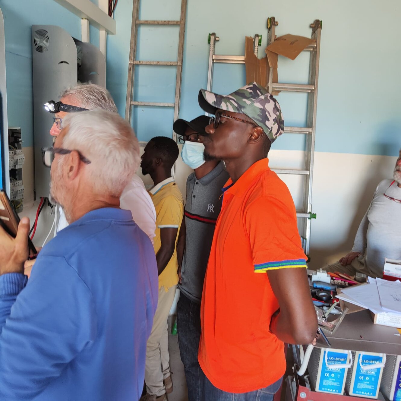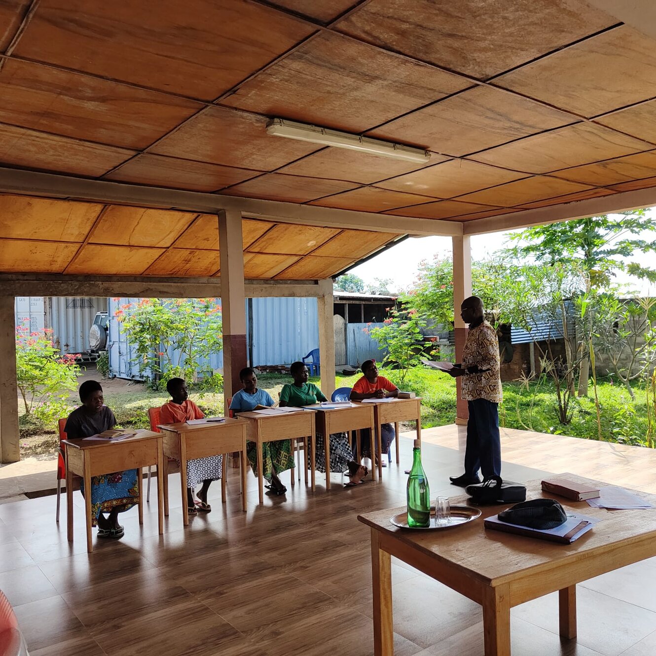 Oggi sembra lunedì perché ieri era festa, tant'è che i 140 bambini della nostra scuola, schierati in file ordinate, hanno marciato, cantato l'inno nazionale e issata la bandiera del Paese come si fa sempre all'inizio della settima. Forse ciò ci ricorda qualcosa della nostra storia nazionale... Il centro di Maison de Paix è grande e su vari livelli per cui siamo distinti in gruppi di lavoro: 7 sono gli insegnanti impegnati nella scuola di cui tre suore, due boliviane Estela e Gloria e una giovane congolese Cristina, poi c'è in aiuto una postulante congolese dal nome biblico Abigael e tre insegnanti laici: Tina, Irene e Emanuel. Con tutti loro abbiamo anche tenuto un incontro pedagogico didattico che hanno apprezzato. Ne faremo un altro prima di partire. Nella centrale di energia c'è soddisfazione. I complessi sistemi di inverter che abbiamo acquistato in Italia, portati qui con il container lo scorso anno, sono stati attivati oggi. Sembra che tutto funzioni dopo alcune preoccupazioni dovute ad un filo non ben serrato in fabbrica. I nostri giovani collaboratori congolesi erano stupiti nel vedere che i nostri volontari erano collegati in remoto con l'azienda di San Benedetto del Tronto che dava assistenza in diretta visionando sul loro computer a molti km di distanza il funzionamento degli apparati e dando informazioni ai nostri tecnici via telefono. Intanto papà Ton Ton, nostro collaboratore fisso e padre di 5 figli, nonché artefice di un rigoglioso orto di cui vi inviamo la foto, sta lavorando per sradicare il tronco del mango che abbiamo tagliato ieri. Ci sono tubi dell'acqua e dell'energia elettrica proprio attaccati e le radici della pianta sono pericolose perché li possono danneggiare. In aiuto i volenterosi giovani del Movimento dei focolari che in questa giornata di pieno sole, per fortuna anche un po' ventilata, danno il loro contributo. Altri giovani stagisti sono nel cantiere della casa dei volontari a dare il loro fattivo apporto essendo falegnami. Carl sta rimontando lo scaffale per fare ordine nell'ultimo container. Il lavoro di ieri non rispettava i sensi di una buona esecuzione e si rifà, siamo qui per imparare a fare bene e tutti dipendiamo dal buon impegno degli altri. Poi tutti dipendiamo dal Signore per cui pregare al mattino, durante l'arco della giornata e alla sera è la vera linfa di questa azione collettiva, anzi comunitaria. In questo momento le postulanti hanno terminato la formazione religiosa di oggi con un bravo prete locale veramente molto ben preparato e abile nell'insegnamento. Mentre i nostri tecnici volontari si apprestano a risalire su questa falda del tetto per installare gli altri 20 pannelli solari che mancano penso ai topi che vivono nel sottotetto e ci svegliano la mattina con rumori molto forti. Ci chiediamo se al mattino facciano footing. Purtroppo papà Jean, nostra storica guardia notturna ha messo il veleno per eliminarli. O loro o noi, l'acqua piovana serve a noi e quando li vediamo correre sulle lastre zincate e vicino ai cavi dei pannelli siamo preoccupati per l'igiene e perché non rodano i fili, esperienza già vissuta qui. Tolleriamo gli uccelli, ma i topi proprio no. Scene di ordinaria amministrazione qui, ma la missione è un bel mix di poesia e di molta prosa. Qui sta il bello. Mbote a tous! Saluti a tutti!