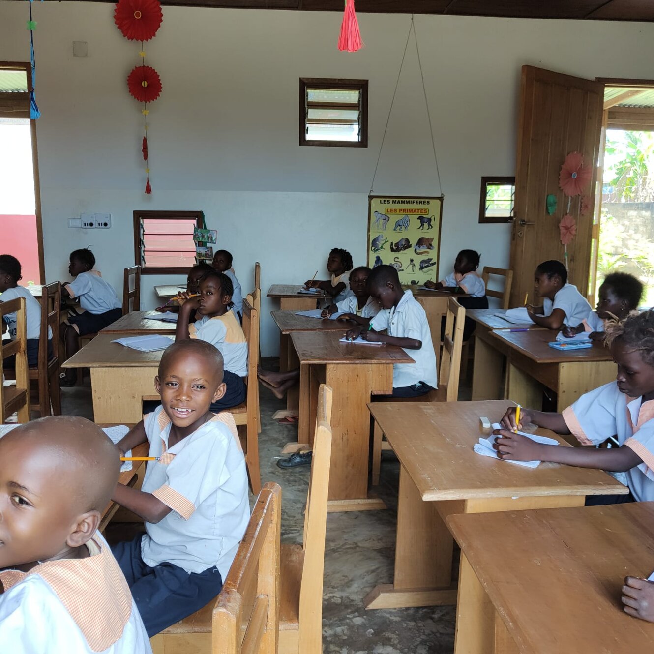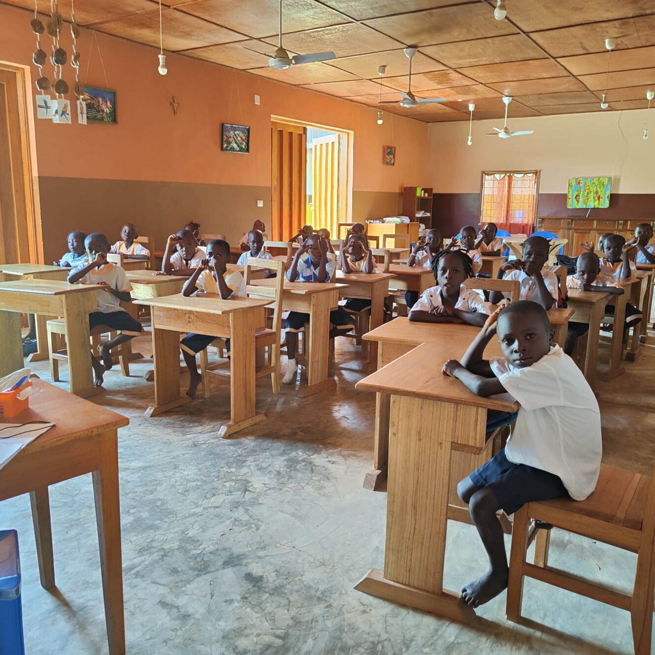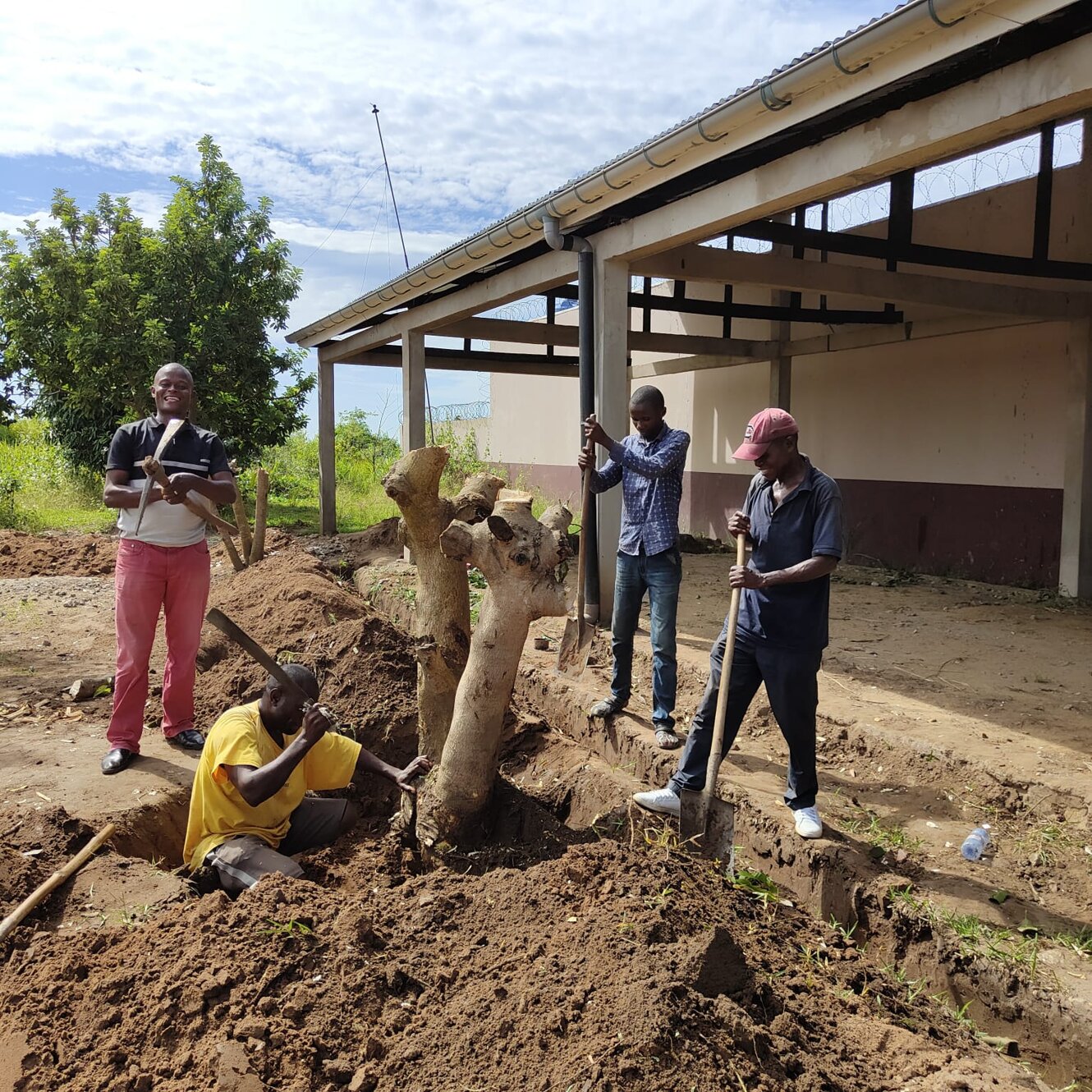 Oggi sembra lunedì perché ieri era festa, tant'è che i 140 bambini della nostra scuola, schierati in file ordinate, hanno marciato, cantato l'inno nazionale e issata la bandiera del Paese come si fa sempre all'inizio della settima. Forse ciò ci ricorda qualcosa della nostra storia nazionale... Il centro di Maison de Paix è grande e su vari livelli per cui siamo distinti in gruppi di lavoro: 7 sono gli insegnanti impegnati nella scuola di cui tre suore, due boliviane Estela e Gloria e una giovane congolese Cristina, poi c'è in aiuto una postulante congolese dal nome biblico Abigael e tre insegnanti laici: Tina, Irene e Emanuel. Con tutti loro abbiamo anche tenuto un incontro pedagogico didattico che hanno apprezzato. Ne faremo un altro prima di partire. Nella centrale di energia c'è soddisfazione. I complessi sistemi di inverter che abbiamo acquistato in Italia, portati qui con il container lo scorso anno, sono stati attivati oggi. Sembra che tutto funzioni dopo alcune preoccupazioni dovute ad un filo non ben serrato in fabbrica. I nostri giovani collaboratori congolesi erano stupiti nel vedere che i nostri volontari erano collegati in remoto con l'azienda di San Benedetto del Tronto che dava assistenza in diretta visionando sul loro computer a molti km di distanza il funzionamento degli apparati e dando informazioni ai nostri tecnici via telefono. Intanto papà Ton Ton, nostro collaboratore fisso e padre di 5 figli, nonché artefice di un rigoglioso orto di cui vi inviamo la foto, sta lavorando per sradicare il tronco del mango che abbiamo tagliato ieri. Ci sono tubi dell'acqua e dell'energia elettrica proprio attaccati e le radici della pianta sono pericolose perché li possono danneggiare. In aiuto i volenterosi giovani del Movimento dei focolari che in questa giornata di pieno sole, per fortuna anche un po' ventilata, danno il loro contributo. Altri giovani stagisti sono nel cantiere della casa dei volontari a dare il loro fattivo apporto essendo falegnami. Carl sta rimontando lo scaffale per fare ordine nell'ultimo container. Il lavoro di ieri non rispettava i sensi di una buona esecuzione e si rifà, siamo qui per imparare a fare bene e tutti dipendiamo dal buon impegno degli altri. Poi tutti dipendiamo dal Signore per cui pregare al mattino, durante l'arco della giornata e alla sera è la vera linfa di questa azione collettiva, anzi comunitaria. In questo momento le postulanti hanno terminato la formazione religiosa di oggi con un bravo prete locale veramente molto ben preparato e abile nell'insegnamento. Mentre i nostri tecnici volontari si apprestano a risalire su questa falda del tetto per installare gli altri 20 pannelli solari che mancano penso ai topi che vivono nel sottotetto e ci svegliano la mattina con rumori molto forti. Ci chiediamo se al mattino facciano footing. Purtroppo papà Jean, nostra storica guardia notturna ha messo il veleno per eliminarli. O loro o noi, l'acqua piovana serve a noi e quando li vediamo correre sulle lastre zincate e vicino ai cavi dei pannelli siamo preoccupati per l'igiene e perché non rodano i fili, esperienza già vissuta qui. Tolleriamo gli uccelli, ma i topi proprio no. Scene di ordinaria amministrazione qui, ma la missione è un bel mix di poesia e di molta prosa. Qui sta il bello. Mbote a tous! Saluti a tutti!