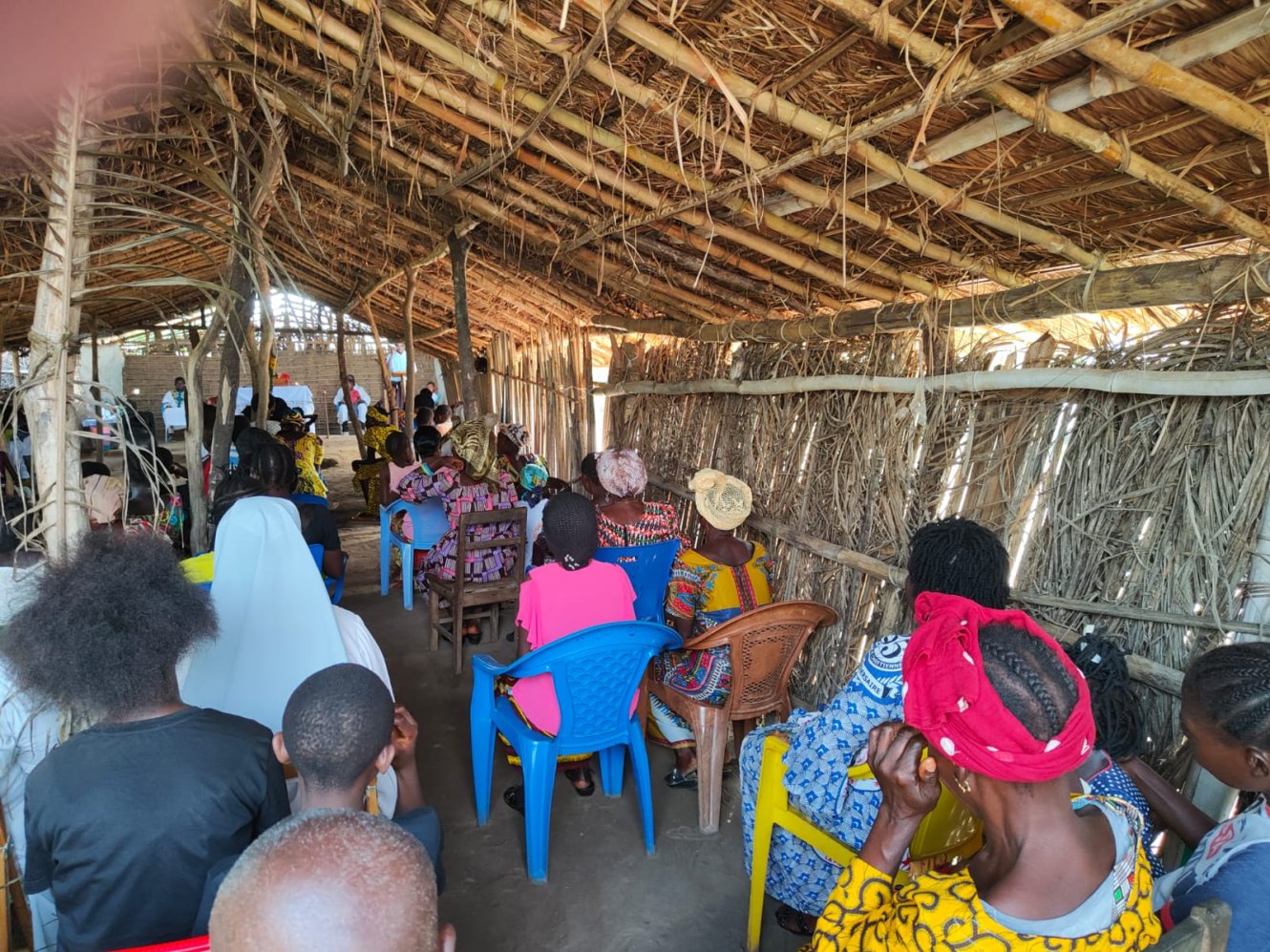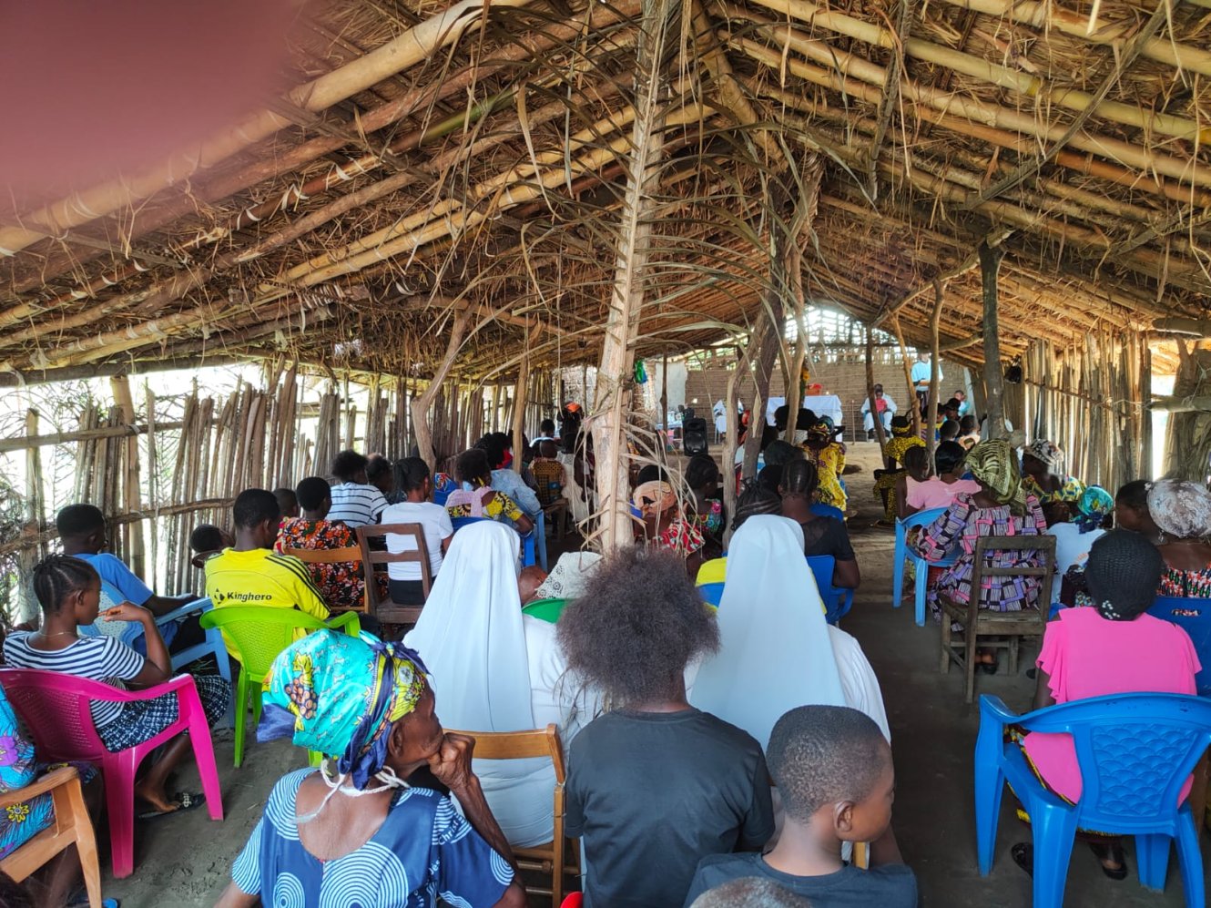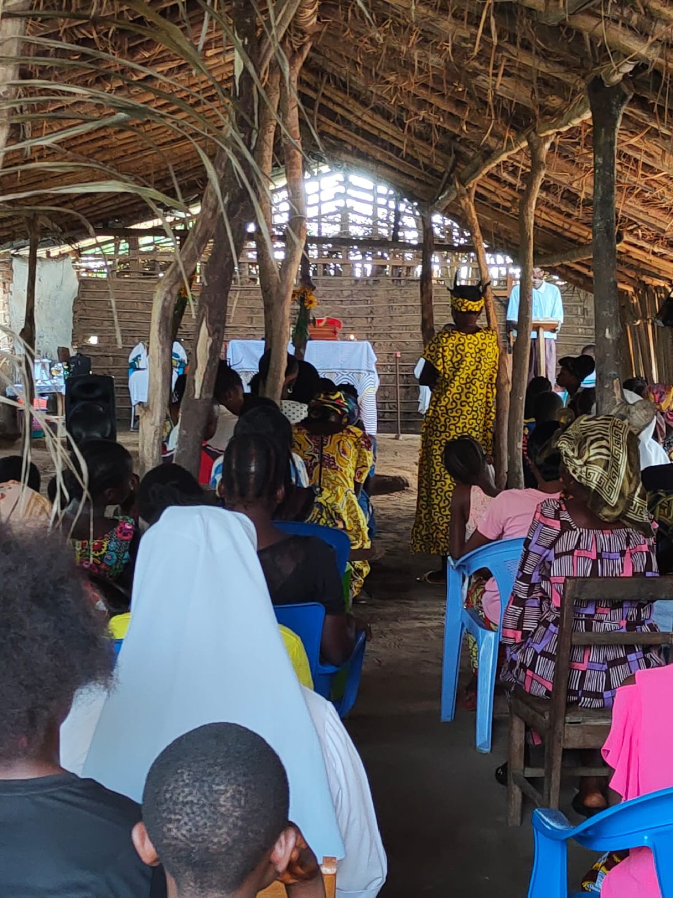 La domenica andando alla messa...in Congo. Venti minuti a piedi dal Centro di Maison de paix su una strada sterrata, chiamiamola così, secondo gli standard locali e salutando cordialmente a destra e sinistra vicini e conoscenti intenti a preparare il luku festivo, polenta di farina di manioca identica a tutti gli altri giorni dell'anno. La sub parrocchia Giovanni Paolo II ci accoglie in tutto il suo splendore di capanna di bambù e tetto di frasche di palma. Salutiamo per primo Ignace, un signore catechista che si meraviglia con gioia che ci ricordiamo il suo nome. Puntuali alle 8,30 si inizia il rito. Belli, davvero belli i canti, dolci e sinuosi, la corale oggi è particolarmente in vena, se non che l'altoparlante, rigorosamente a batteria da queste parti, decide di non collaborare più. Nessun problema, si procede a braccio e il celebrante parte malembe, malembe, cioè piano piano, ma poi si infervora, alza il tono della voce e sottolinea vistosamente, con gesti molto espressivi, il contenuto che comunica. Ai fedeli scappa anche qualche risata e qualche applauso, ci dispiace di non capire e ciò ci ricorda che siamo Mundele, cioè bianchi, ma ci consoliamo partecipando convinti a qualche amen, che come ben si sa è internazionale. Il coro non si scoraggia, riprende vigorosamente con il tam tam appena accordato con fuoco e acqua prima della messa, e non solo si canta, si danza pure con gioia e vitalità che in Africa sovrabbondano sempre. Poiché siamo cattolici anche noi capiamo le fasi della messa e capiamo che il Signore universale ama essere lodato in tutte le lingue del mondo. Sotto questa capanna di paglia e di fango, che fa tanto presepe, ci accorgiamo che il Dio Amore in cui crediamo non ha colore, ma ha il calore della fede che ce lo rende presente e vivo perché qui c'è molto meno che si frappone tra noi e Lui. Gli occhi di tutti i bimbi, spesso in braccio o sulle spalle dei loro fratelli più grandi, ci scrutano curiosi. Li ricambiamo con un sorriso, quasi a scusarci di essere diversi e di incutere  loro un po' di paura. Mentre rientriamo a piedi sentiamo l'eco del salmo 8 che ci accompagna, questa volta in Kikongo..."O Signore nostro Dio, quanto è grande il tuo nome su tutta la terra!