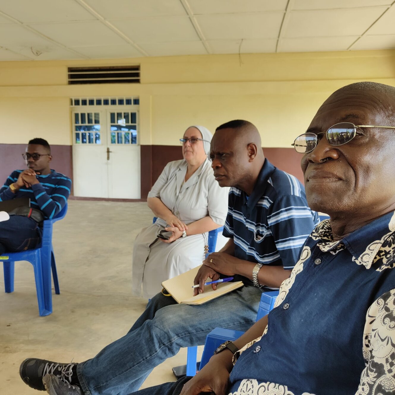 È bello raccontare agli amici italiani come si vive qui in missione. Nino, Dario, Bobo ed io siamo ospitati all'interno di Maison de paix in due stanze in muratura con bagno e doccia, anche se purtroppo è una settimana che per ragioni tecniche praticamente si è senza acqua né energia elettrica. Si comprende come questi due aspetti dell'energia, collegati fra di loro, siano l'obiettivo più immediato e urgente della spedizione. Il lavoro da fare è tanto e ogni giorno ci sono riservate delle sorprese, a volte dure da accettare. La comunità delle suore Francescane Angeline è costituita da 12 membri tra suore, novizie e postulanti congolesi e fa di tutto per supportarci, nonostante le continue difficoltà anche per loro. Ci si alza presto verso le 6, le sorelle pregano in francese in cappella e noi ci uniamo a loro. Il clima la mattina è sempre plumbeo, il cielo pesante e l'umidità molto alta. Dopo la colazione ognuno di noi si dedica ai tanti impegni. La paura di non riuscire a completare tutto il previsto prima di ritornare in Italia è tanta. Non stiamo un attimo fermi, le cose da fare incalzano e lo stress psicofisico è alto, ma siamo uniti, sereni e motivati. Ieri abbiamo incontrato 11 giovani del luogo, aderenti e selezionati dal Movimento dei focolari, con i quali stiamo attivando una collaborazione per la gestione delle due scuole professionali di falegnameria e sartoria e della casa alloggio dei volontari. Tutti i giovani si sono dimostrati interessati allo stage di due settimane che abbiamo proposto loro. Si distribuiscono tra i tre settori di cantiere, elettrotecnico e pedagogico di competenza. La giornata ci riserva un sole potente verso mezzogiorno e poi il solito, anche potente, scroscio di pioggia pomeridiano e serale. Anche stasera pregheremo per tutte le nostre famiglie e gli amici lasciati a casa sapendo che tutti loro sono qui con noi con il pensiero e la partecipazione. Intanto sentiamo sullo sfondo il canto di tanti uccelli, ma soprattutto dei nostri 140 alunni della scuola materna ed elementare che sono la grande gioia e speranza di questo nostro comune impegno. A presto per le prossime notizie. Grazie a tutti, anzi, Matondo Minghi!