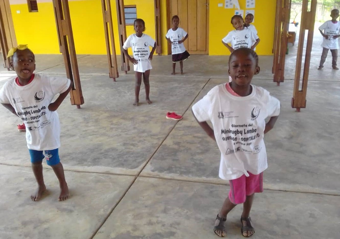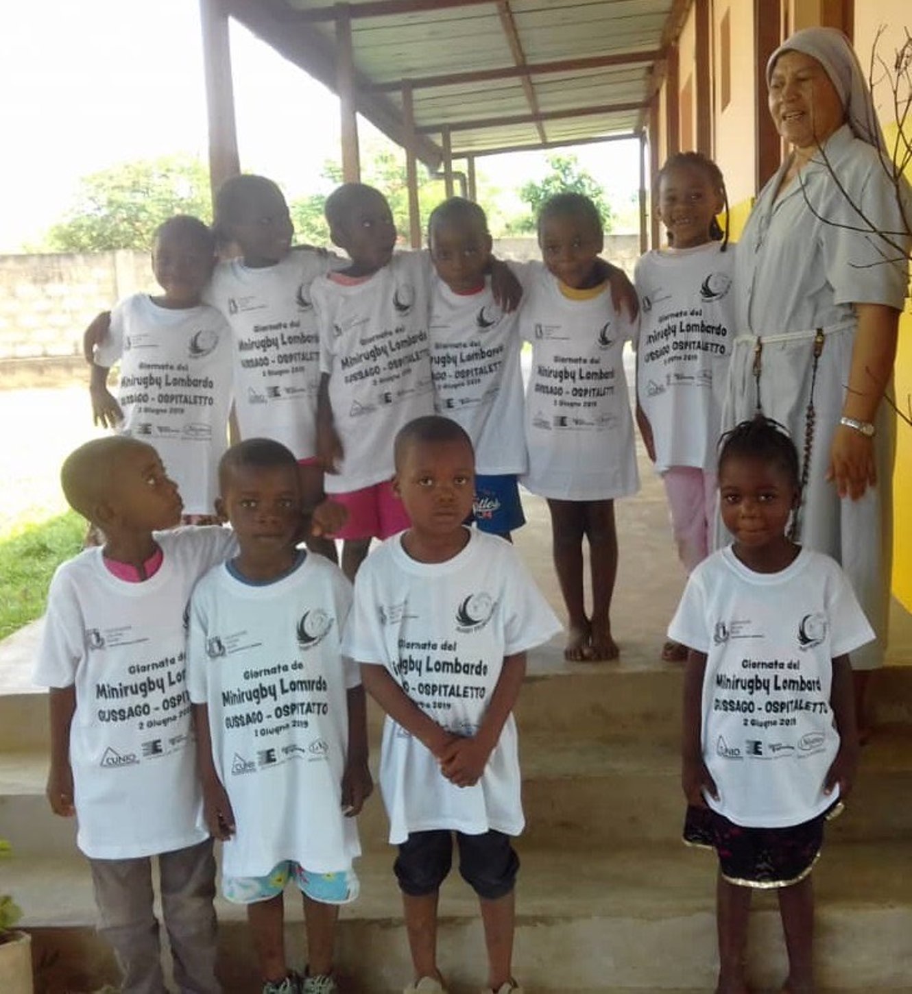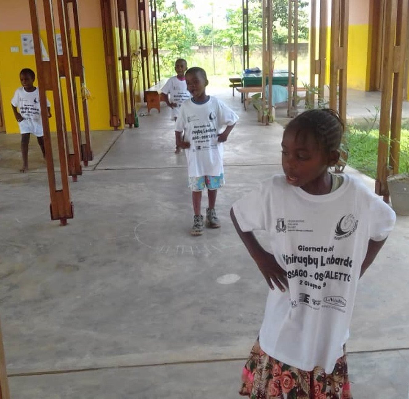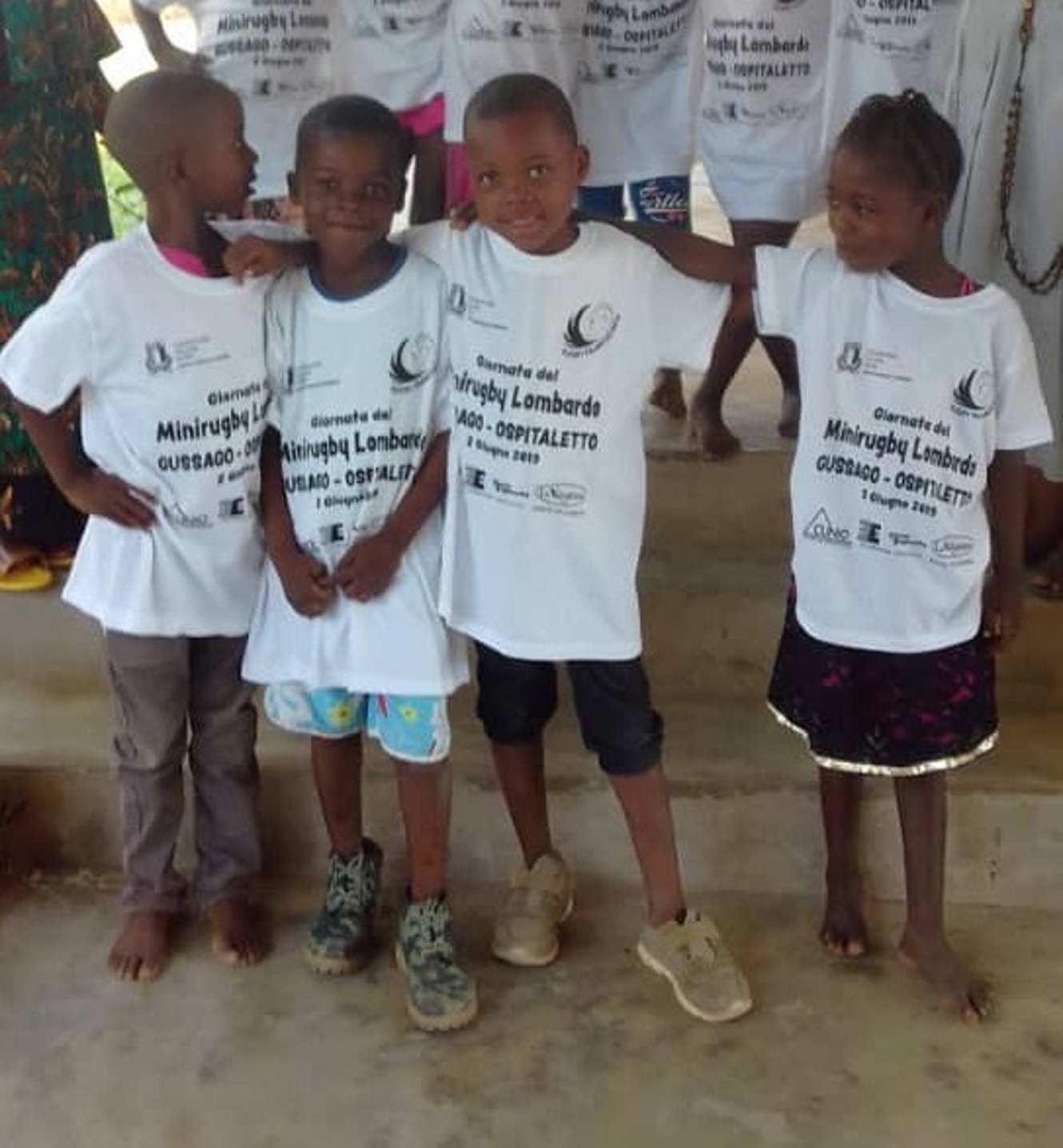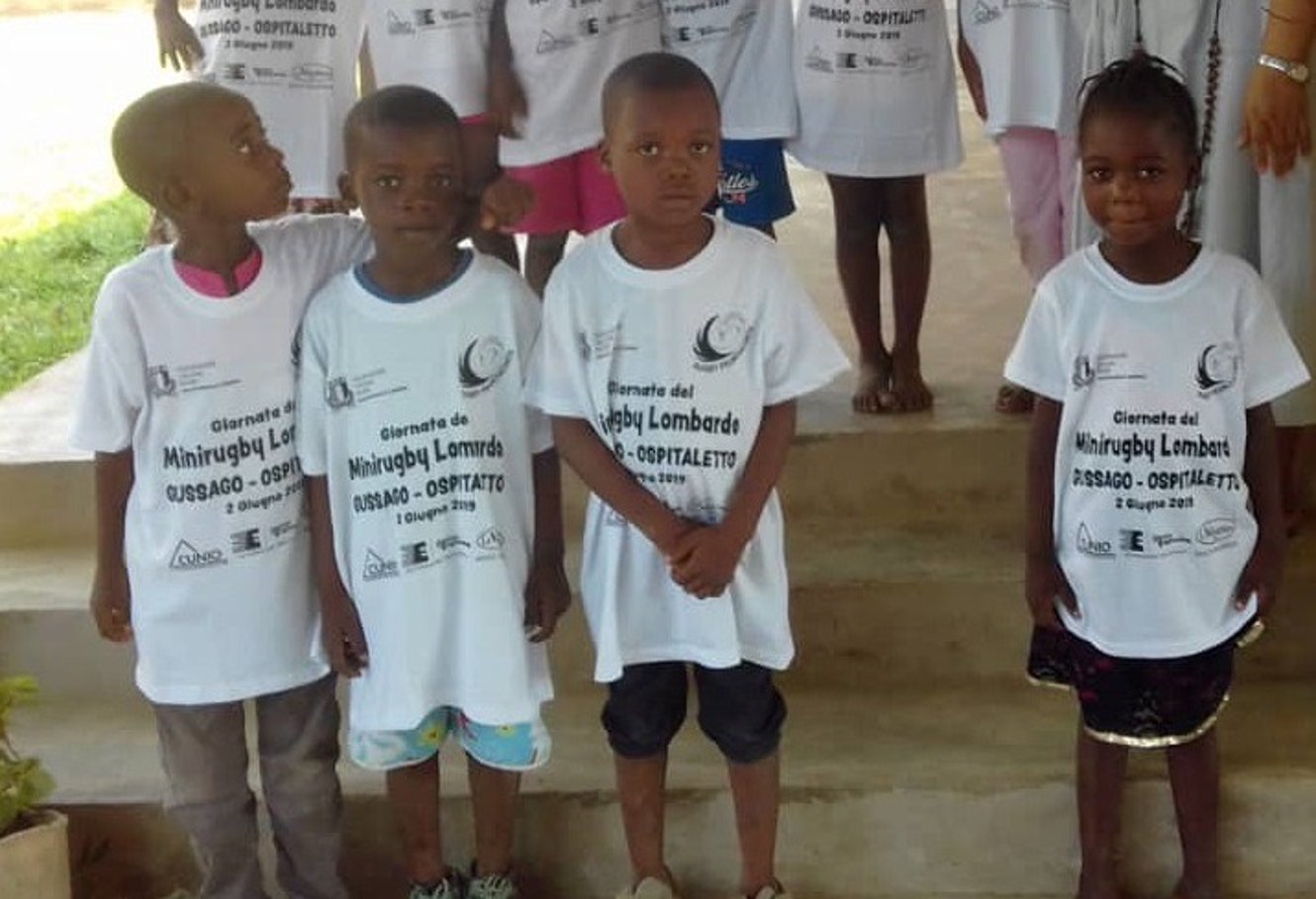 Ecco le foto dei bambini e delle bambine di Maison de Paix che indossano le magliette generosamente donate, insieme a borracce e k-way, da Giorgio Chiappa presidente del Rugby Ospitaletto.