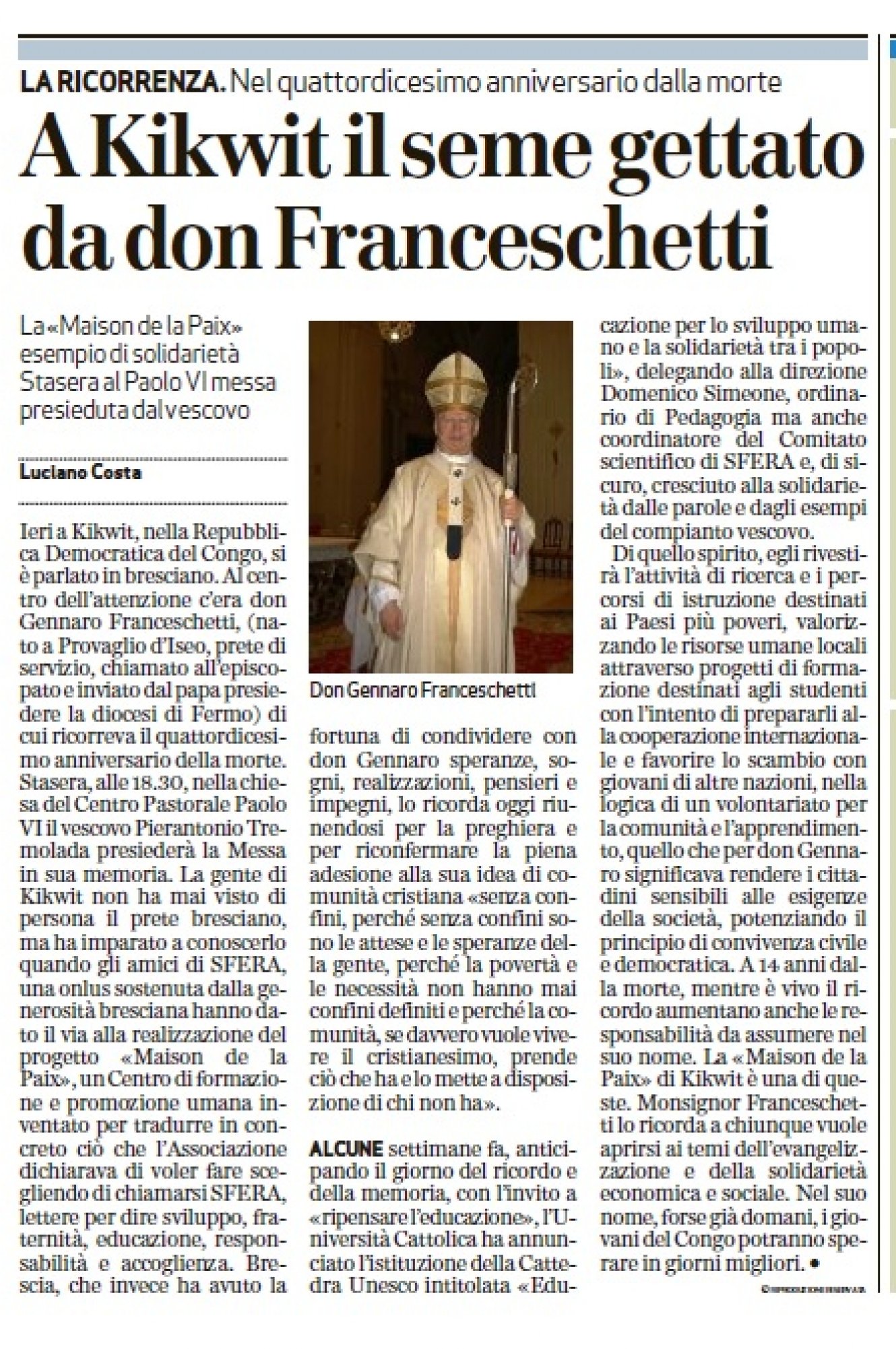 Nel 14° anno dalla morte di Mons. Franceschetti il Vescovo di Brescia Pierantonio Tremolada celebra la Santa Messa ricordando l'iniziativa di SFERA in Congo vera e propria testimonianza di solidarietà